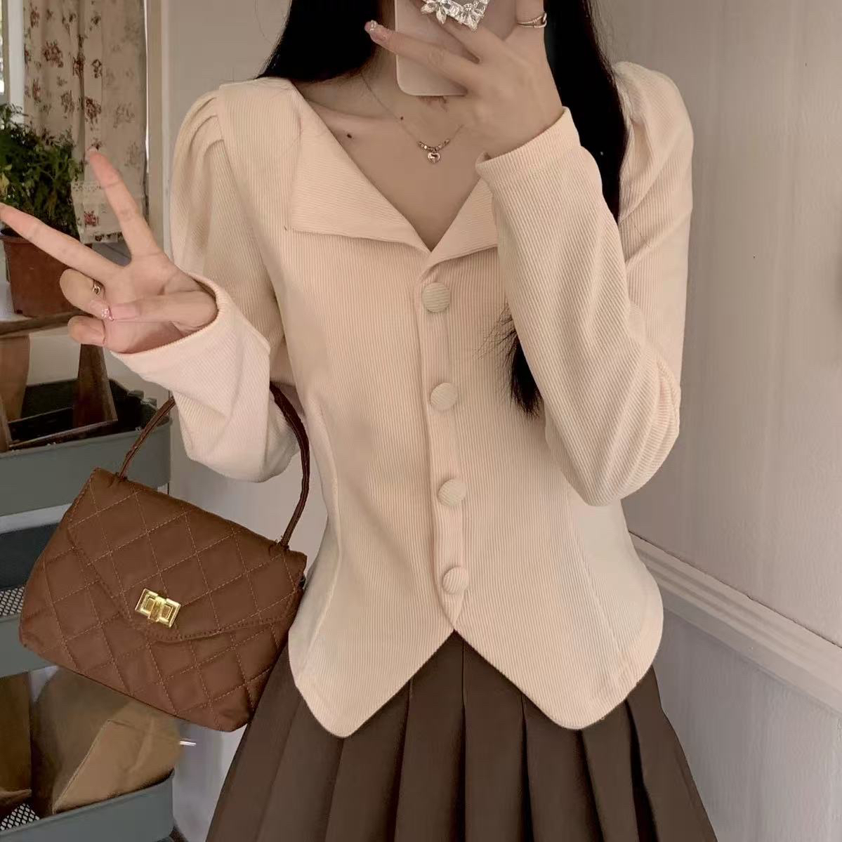 法式v领长袖衬衫女秋季2025年新款独特别致上衣短款洋气卡腰小衫